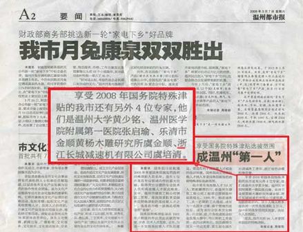 2009年2月24日,浙江省人事廳正式公布了我省2008年度享受政府特殊津貼人員名單,其中溫州市享此殊榮的只有5人,而鹿城區(qū)僅我司虞培清董事長一人。