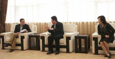 公司研究所所長兼技術(shù)中心主任周國忠博士(中)正在向省人事廳厲處長(左)介紹人才及科研技術(shù)情況