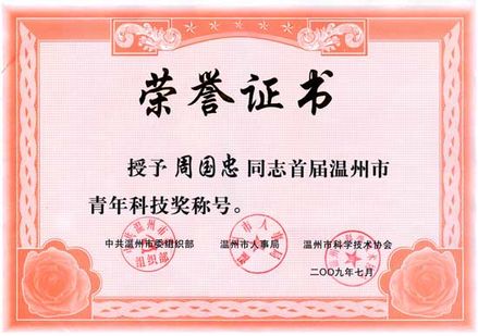 溫州市青年科技獎榮譽證書