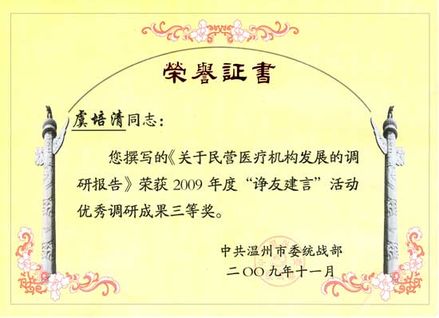 2009年度“諍友建言”活動優(yōu)秀調(diào)研成果三等獎 榮譽證書