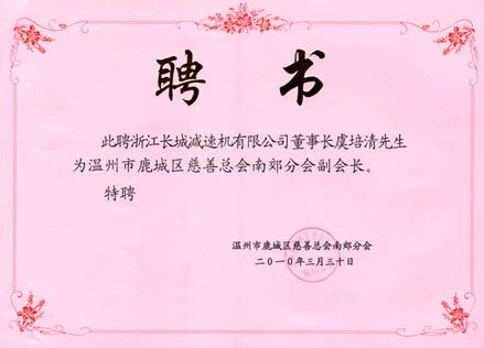 虞董溫州市鹿城區(qū)慈善總會南郊分會副會長聘書