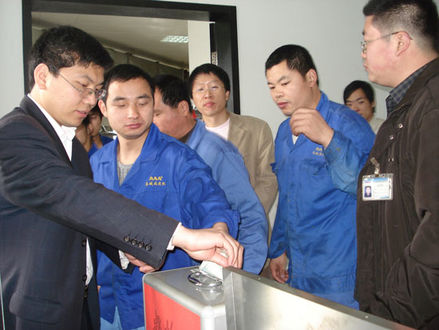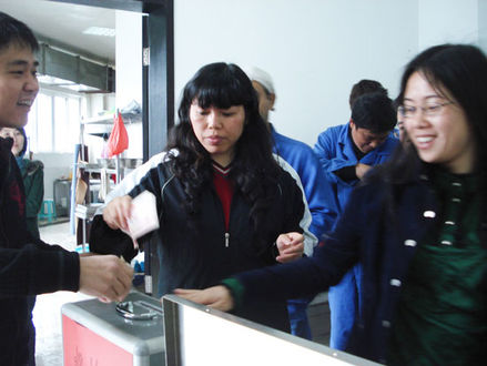 圖為募捐活動現(xiàn)場:車間員工捐款