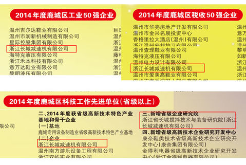 近日,鹿城區(qū)經濟工作會議隆重召開,我司榮獲“2014年度鹿城區(qū)工業(yè)50強企業(yè)”榮譽、“2014年度鹿城區(qū)稅收50強企業(yè)”榮譽、“2014年度鹿城區(qū)科技工作先進單位(省級)”、“2014年度獲省級高新技術骨干企業(yè)”、新增“省級企業(yè)研究院”