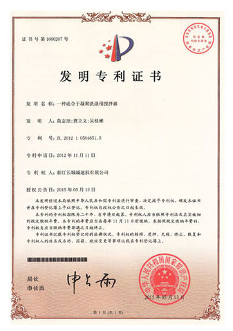 一種適合于凝聚洗滌用攪拌器--國(guó)家發(fā)明專(zhuān)利證書(shū)