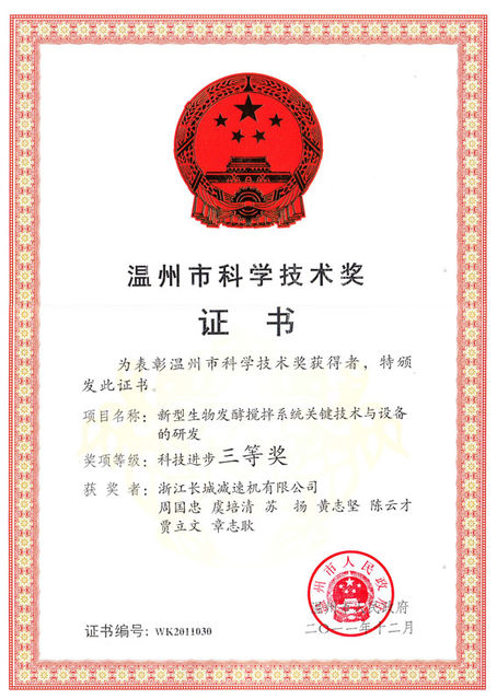 浙江長(zhǎng)城減速機(jī)有限公司 “新型生物發(fā)酵攪拌系統(tǒng)關(guān)鍵技術(shù)與設(shè)備的研發(fā)”項(xiàng)目 科技進(jìn)步三等獎(jiǎng)